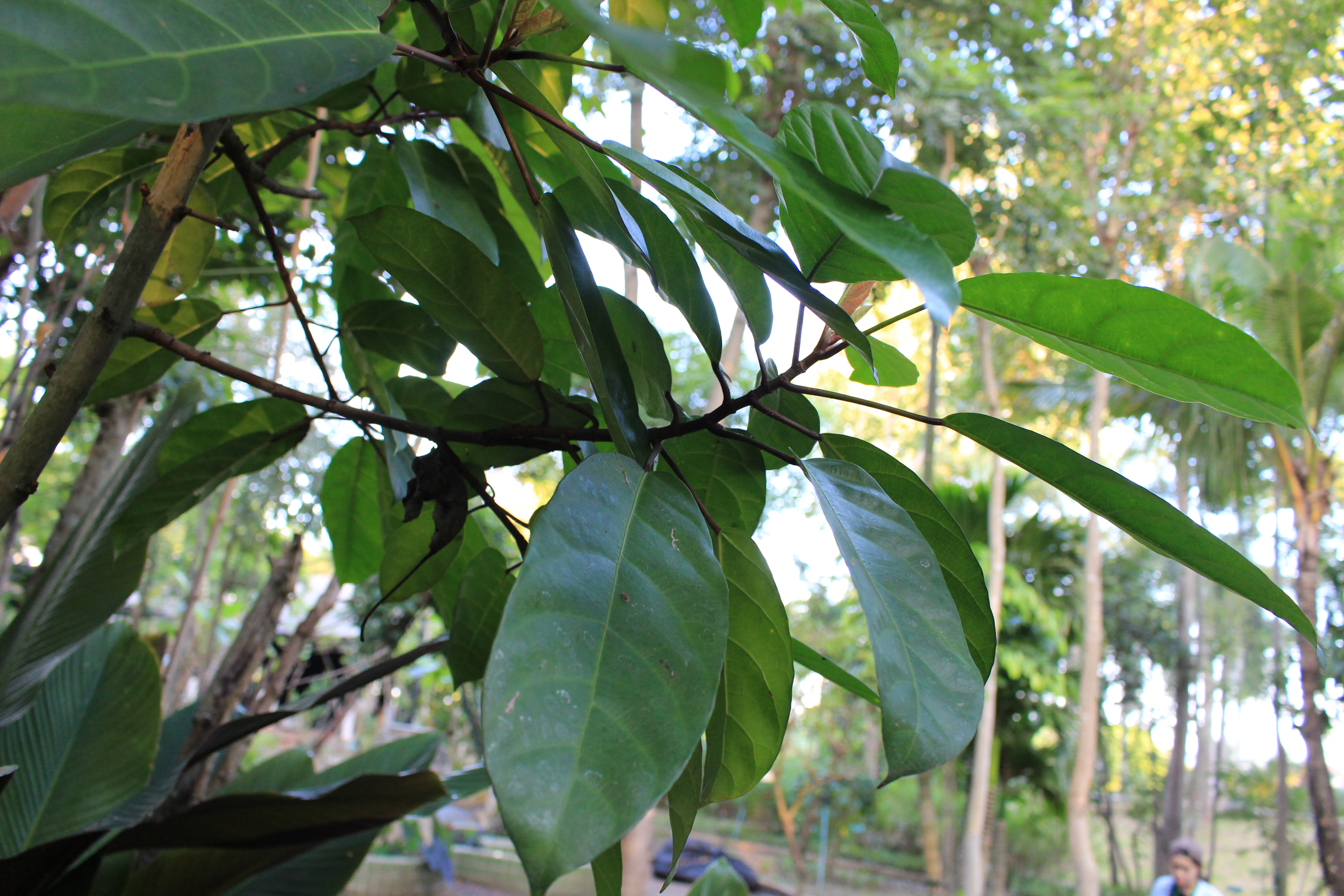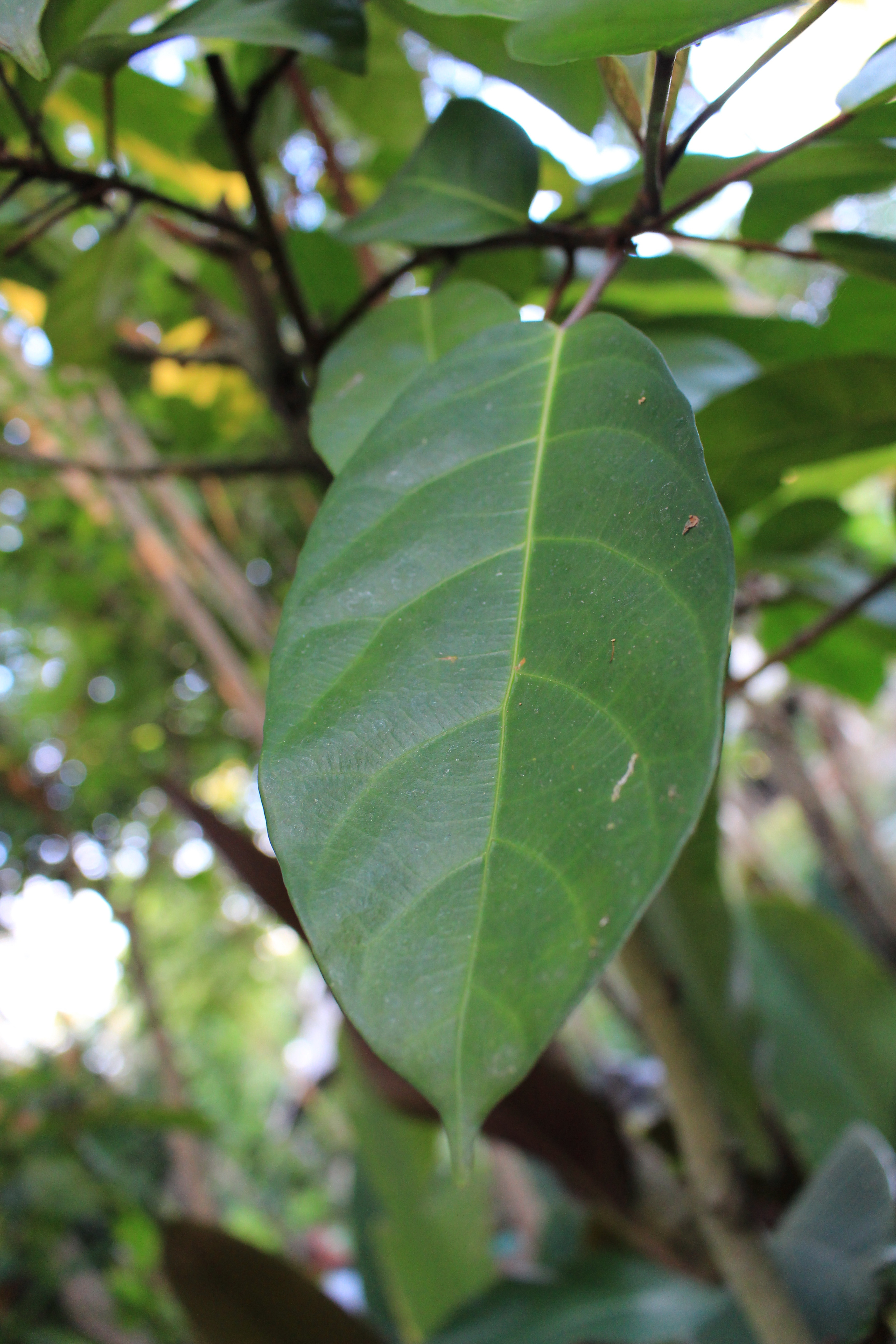ใบ ใบเดี่ยว เรียงเวียนสลับ รูปไข่แกมรูปใบหอก ปลายใบแหลม โคนใบมนหรือกลม ขอบใบเรียบ เป็นคลื่นเล็กน้อย แผ่นใบค่อนข้างหนาและเหนียว ย่นเป็นลอน ใบสีเขียวเข้มเป็นมัน ใบอ่อนสีเขียวอมน้ำตาล