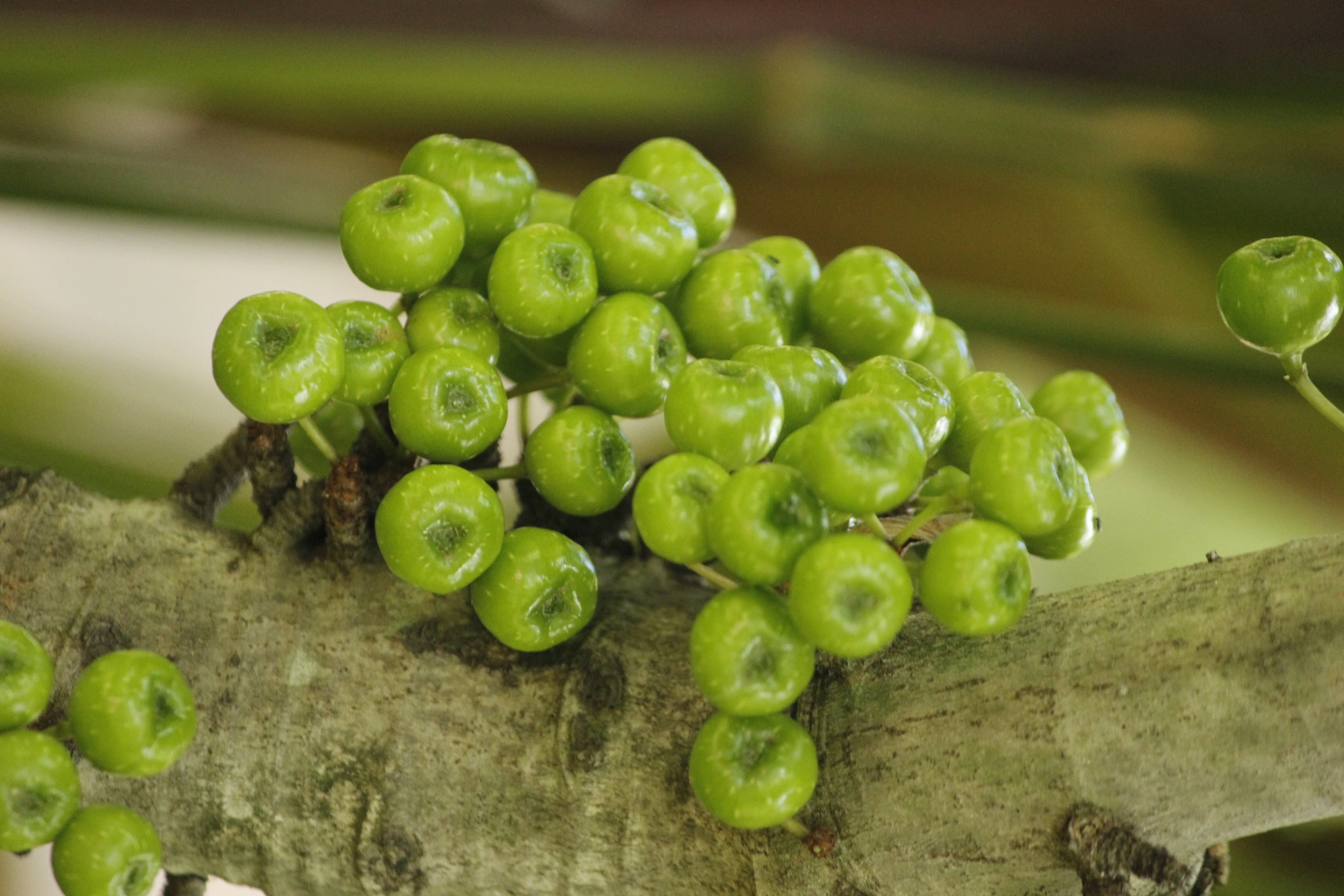 ผล ผลดิบมีสีเขียว เมื่อสุกแล้วมีสีเหลืองอมขาว ทรงกลมแป้นหรือรูปหัวใจกลับ ผลมีเส้นผ่าศูนย์กลางขนาด 15-27 มม.