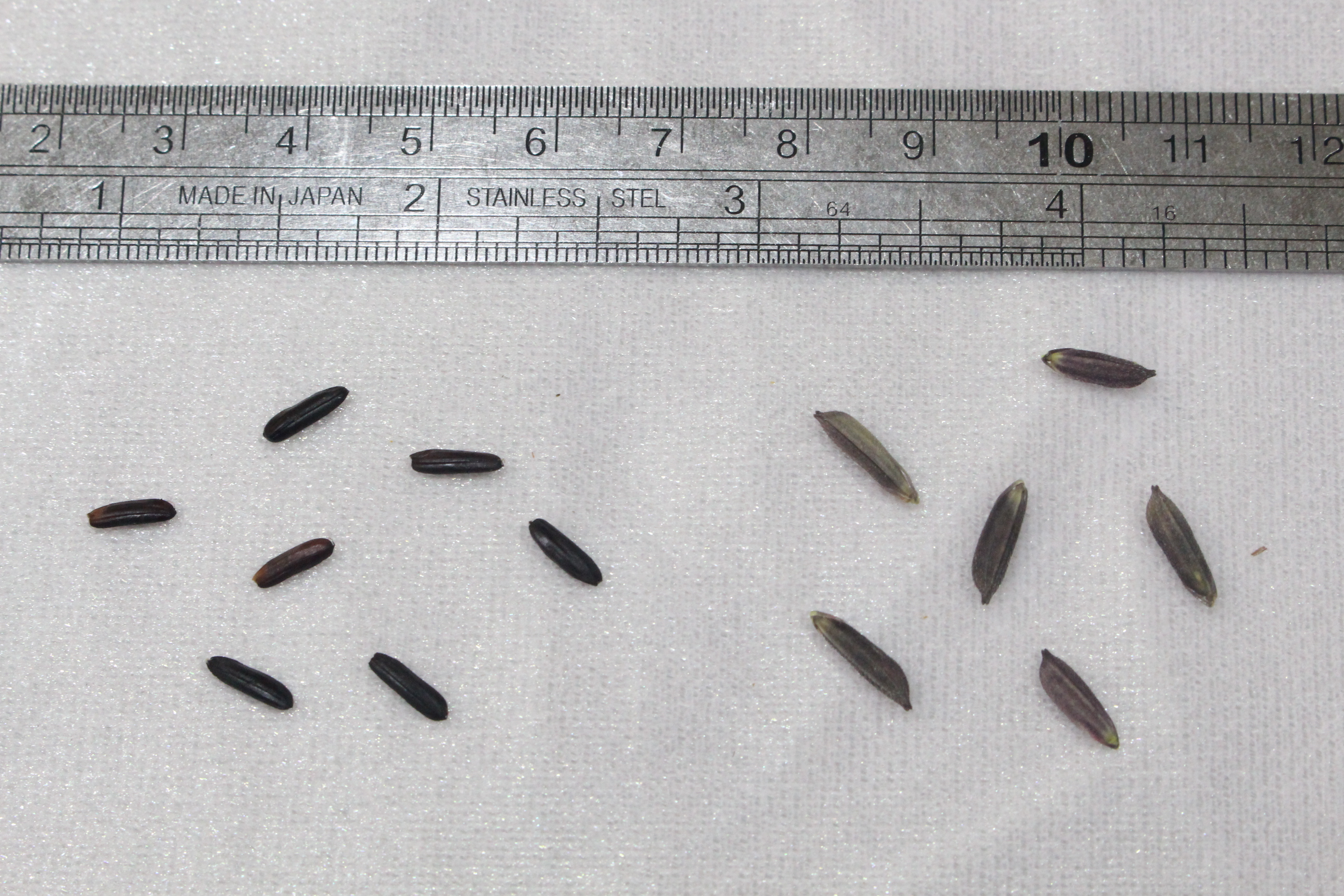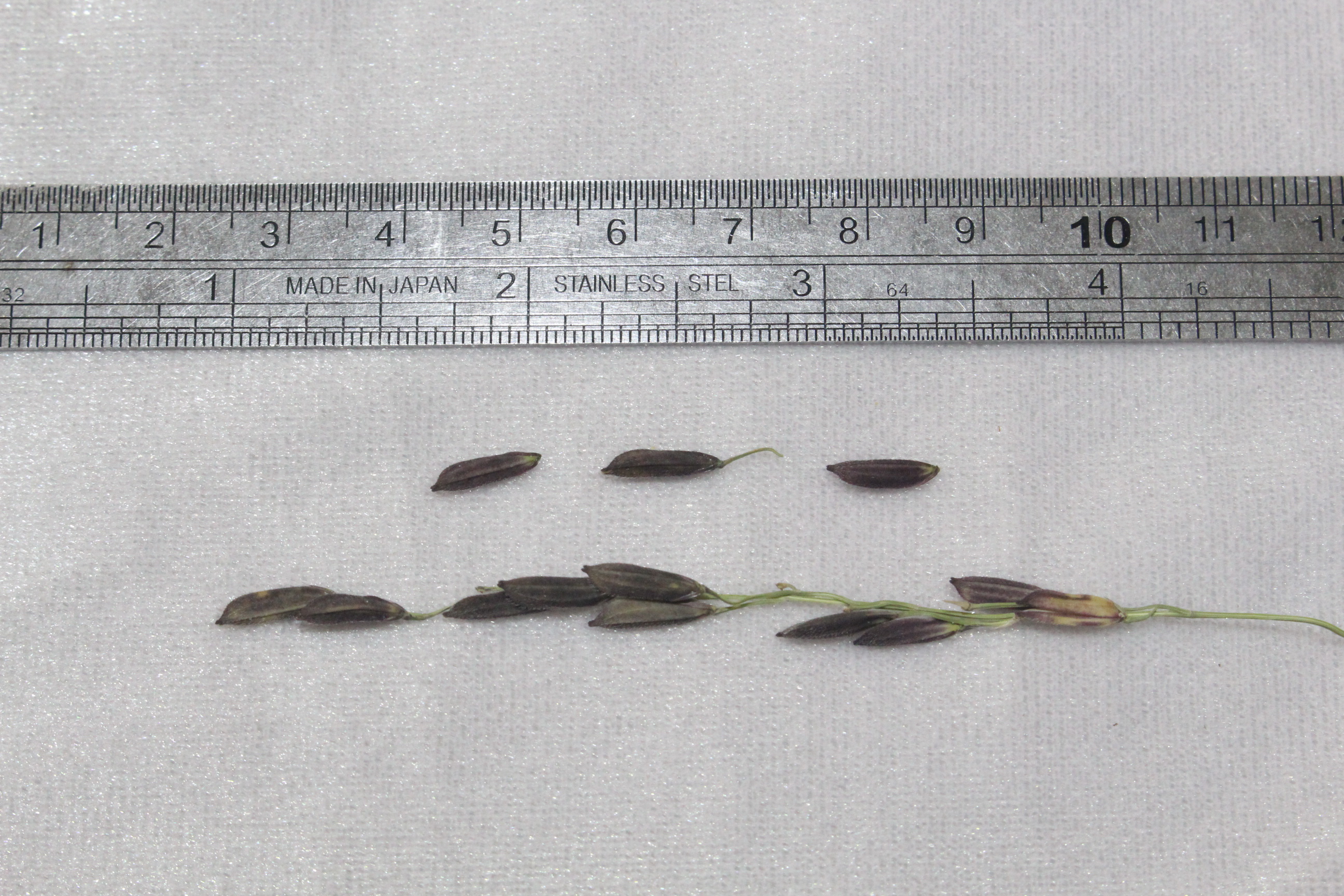 ผล รูปร่างเมล็ดเรียวยาว สีม่วงเข้ม เมล็ดข้าวเปลือกยาว 11 มม. ข้าวกล้อง 7.5 มม. ข้าวขัด 7.0 มม. ข้าวกล้องมีความนุ่มนวลมาก