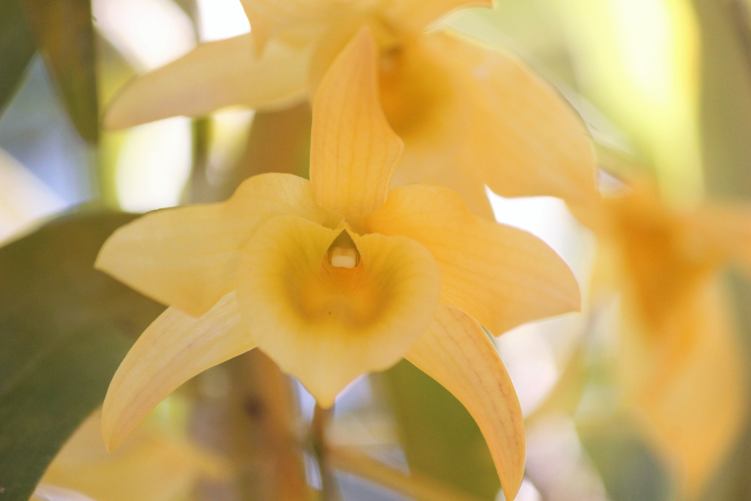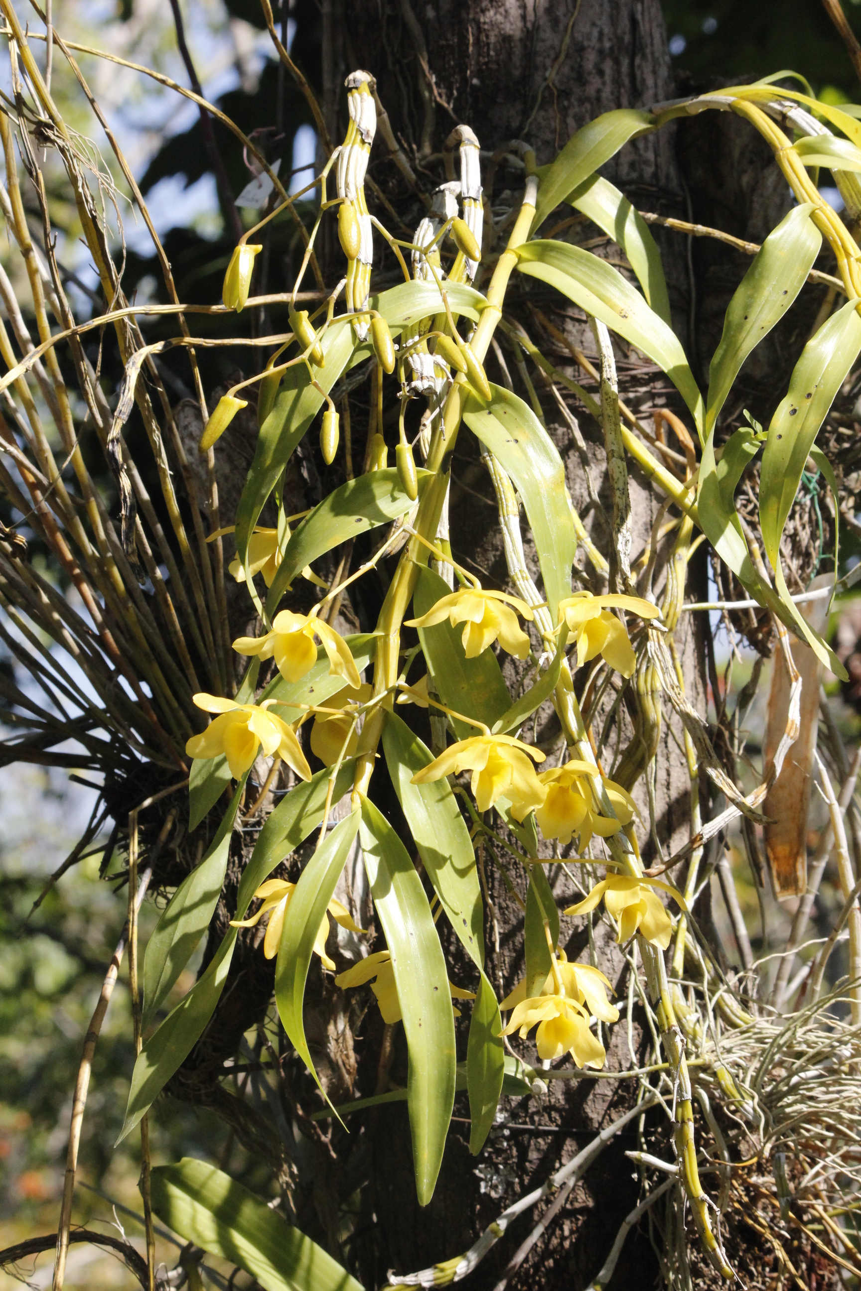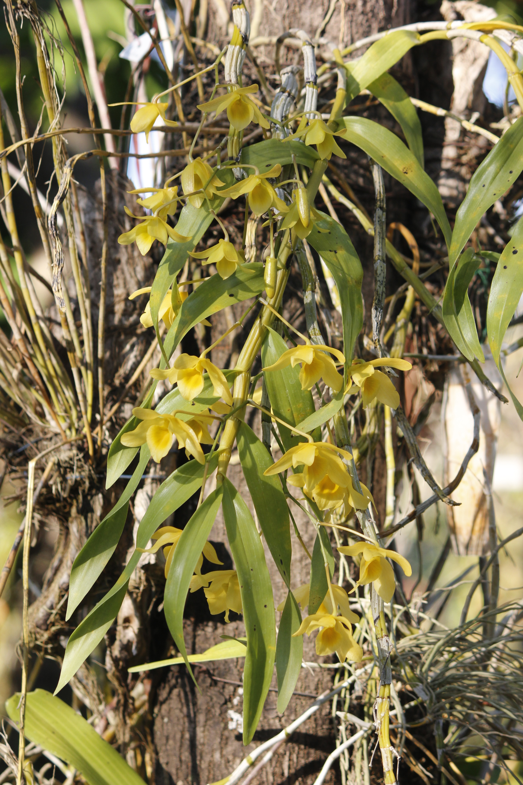 ดอก ช่อดอกออกที่ข้อบนลำลูกกล้วย แต่ละช่อมี 3-6 ดอก ดอกขนาด 3.5-4.0 ซม. ดอกสีเหลือง มีสองพันธุ์คือพันธุ์ที่ดอกเหลืองล้วน กับพันธุ์ที่มีแต้มสีม่วงแดงบริเวณกลีบปาก