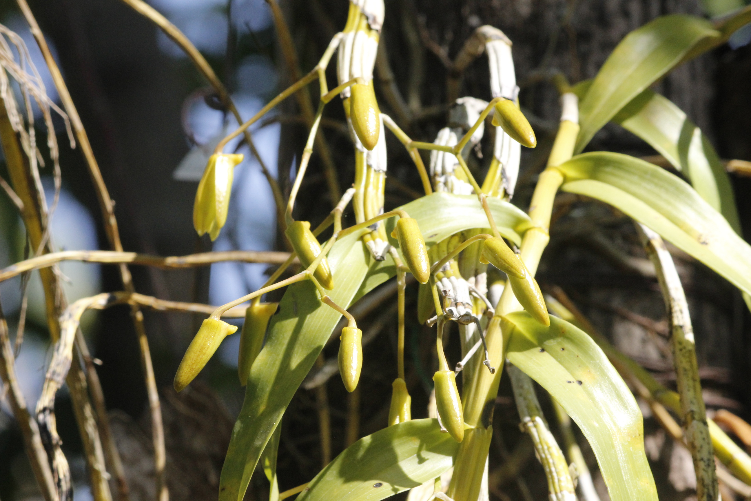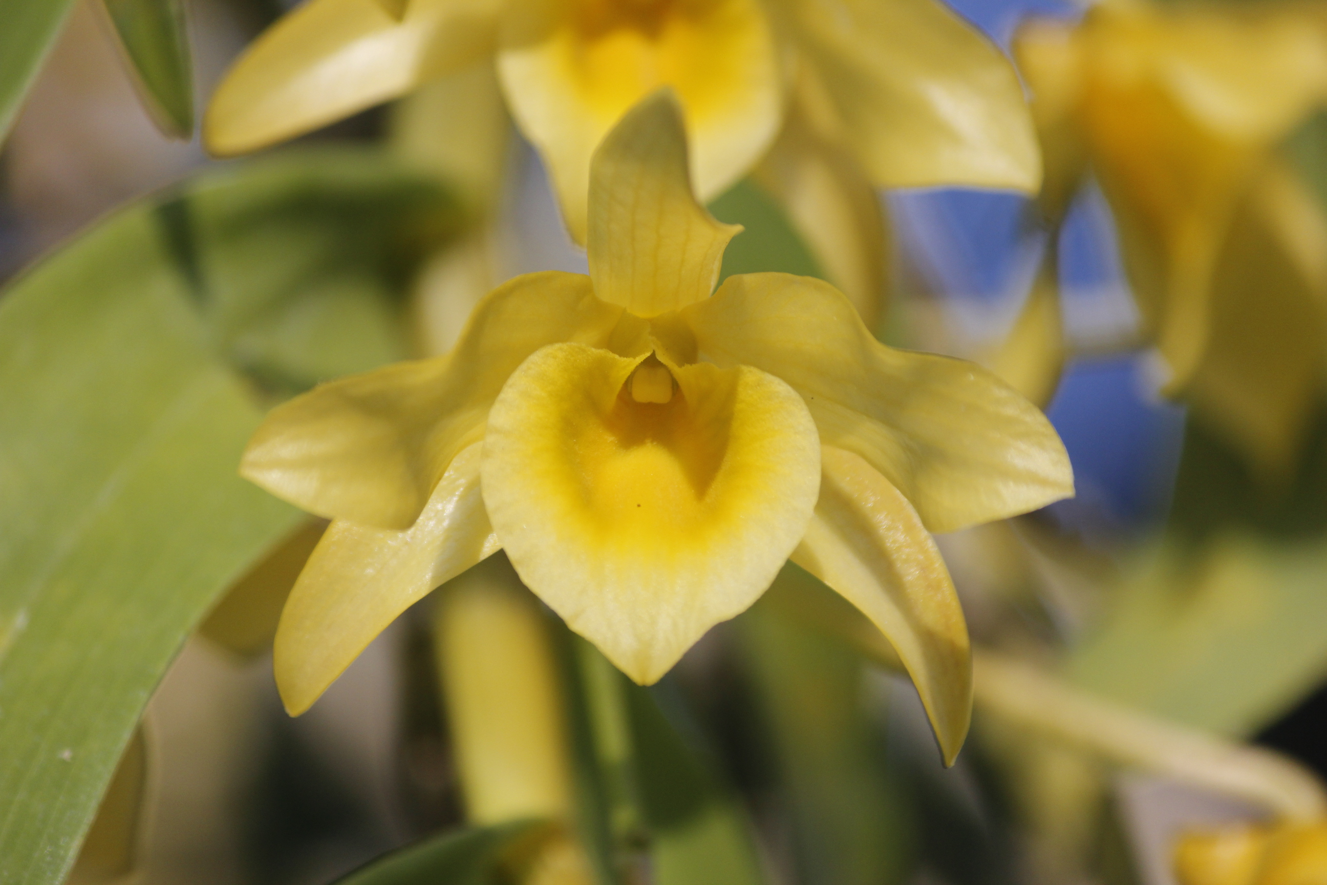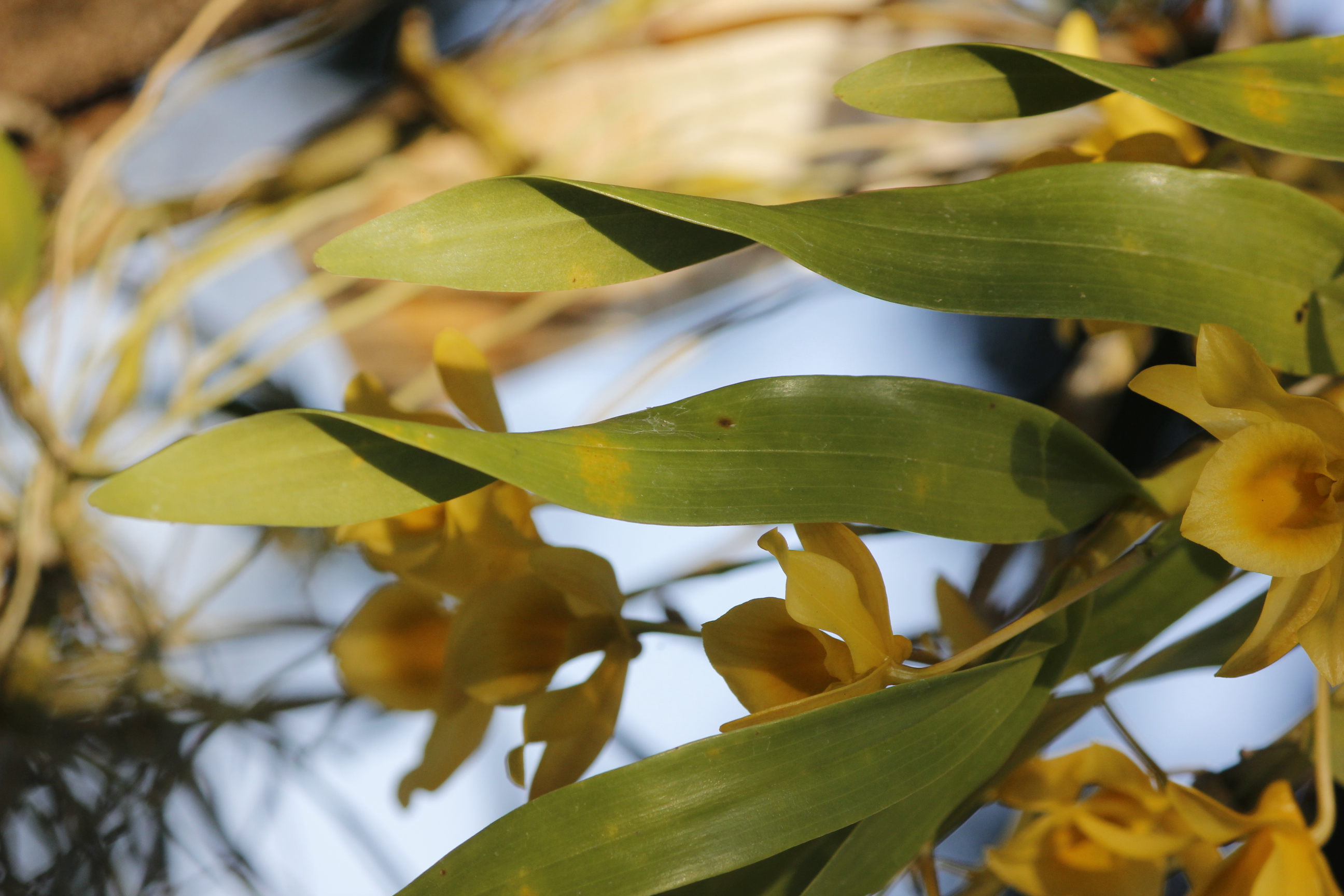 ดอก ช่อดอกออกที่ข้อบนลำลูกกล้วย แต่ละช่อมี 3-6 ดอก ดอกขนาด 3.5-4.0 ซม. ดอกสีเหลือง มีสองพันธุ์คือพันธุ์ที่ดอกเหลืองล้วน กับพันธุ์ที่มีแต้มสีม่วงแดงบริเวณกลีบปาก