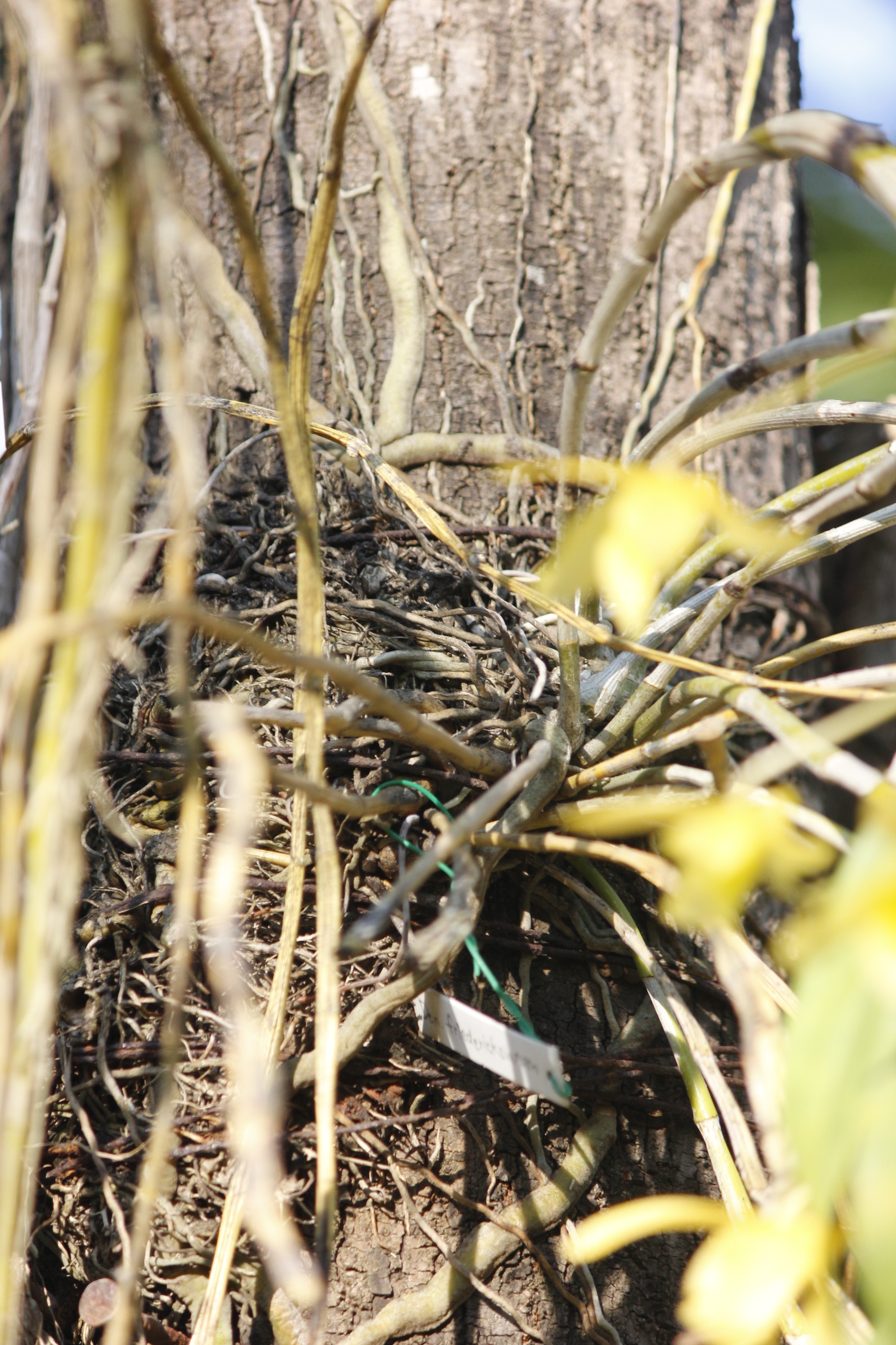 ลำต้น กล้วยไม้อิงอาศัย เจริญเติบโตทางด้านข้าง ลำลูกกล้วยห้อยลง เส้นผ่าศูนย์กลาง 1.0-1.5 ซม. ยาว 40-70 ซม. ผิวแห้งเป็นสันและมีร่องตามยาว